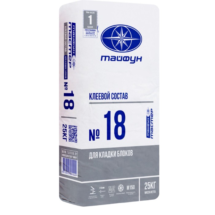 Тайфун-Мастер 18 имеет улучшенный состав по сравнению с клеем для кирпича. Мешок 25 кг. Средний расход мешка 25 кг: на 0.7 м.куб. блока - 1 мешок. Производитель РБ.