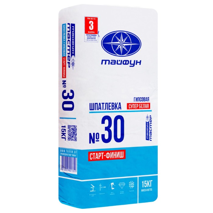 Шпатлёвка «Тайфун Мастер» №30 применяется для окончательного выравнивания поверхностей стен и потолков внутри помещений выполненных из гипсокартонных и гипсоволокнистых плит, а также гипсовых, известково-цементных штукатурок и бетона. Может применяется для выравнивания неровностей и выбоин, сколов на поверхности и для заполнения стыков и швов гипсокартонных (ГКП)и гипсоволокнистых плит (ГВП).