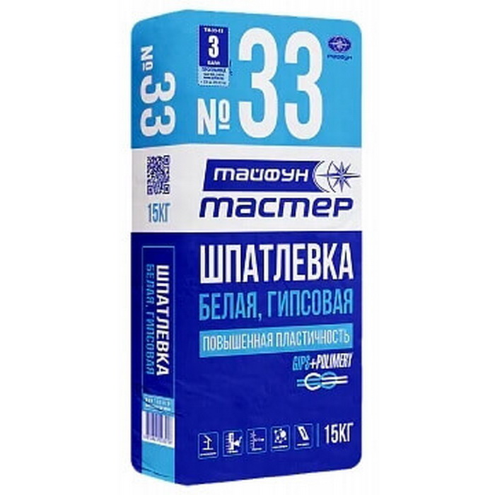 Шпатлёвка «Тайфун Мастер» №33 применяется для окончательного выравнивания поверхностей внутри помещений выполненных из гипсокартонных (ГКП) и гипсоволокнистых (ГВП) плит, а также гипсовых, известково-цементных, цементных штукатурок и бетона. Состав может применяться для заделки выбоин, сколов на поверхности, для заполнения швов в стыках ГКП и ГВП. Средний расход: мешок 20 кг - 20 м. кв. в один слой.