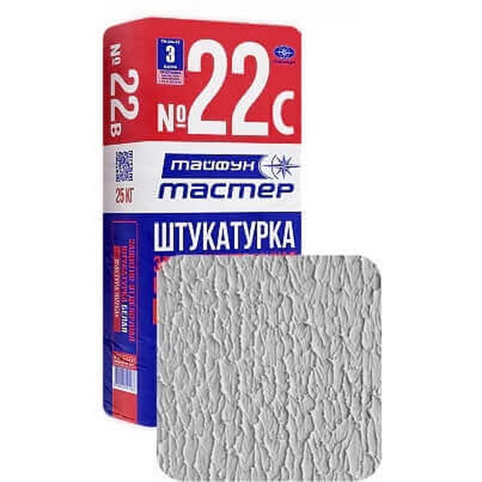 Защитно-отделочная штукатурка «Тайфун Мастер 22с» серого цвета (так называемая шуба) применяется в качестве защитно-декоративного слоя при устройстве теплоизоляционной системы, как снаружи, так и внутри зданий. Наносится валиком. Средний расход: мешок 25 кг - 8 м.кв.